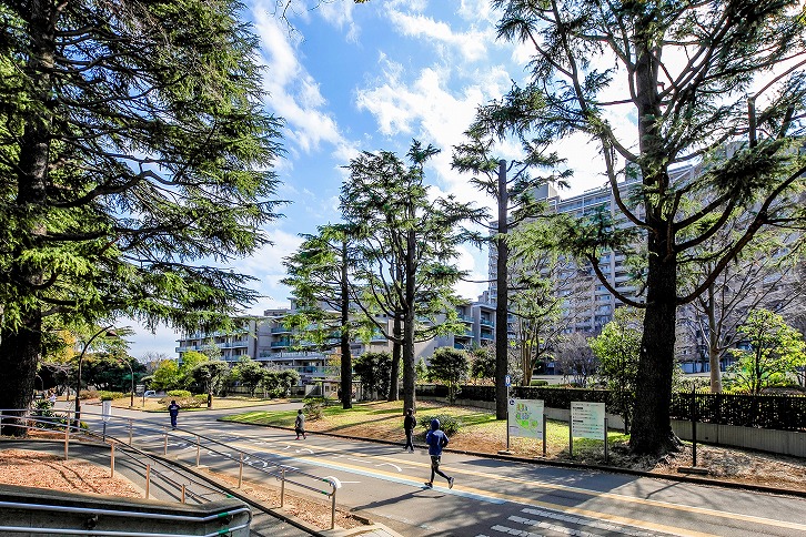 駒沢オリンピック公園の南側に立地する深沢ハウス。住棟は13あり、総戸数は772戸。既存樹木を活かした植栽は公園との一体化を意図したもの