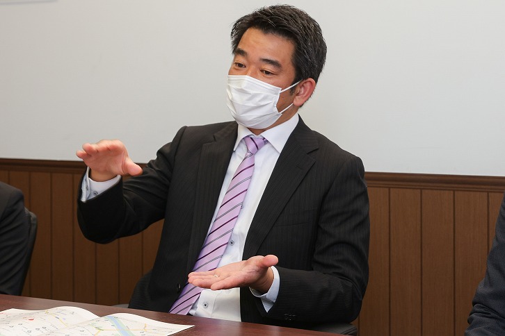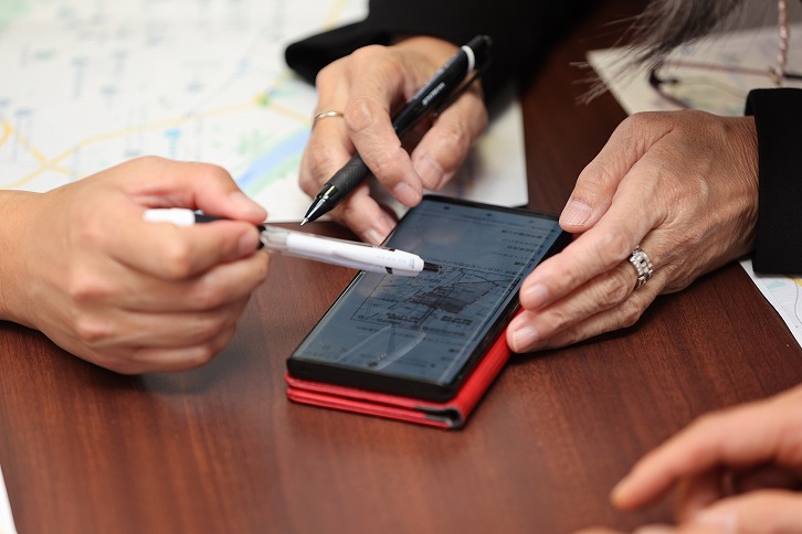地元に詳しい営業員が街の様子、開発の計画などを具体的に説明。「知りたいことはどんどん質問してください」と三人