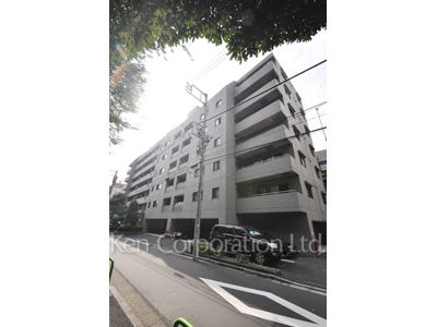 ラポール三田は港区三田五丁目の住宅街に佇むマンションです。タイル貼りの外観とエントランス脇の植栽、石張りのエントランスロビーが落ち着いた雰囲気を醸し出しています。