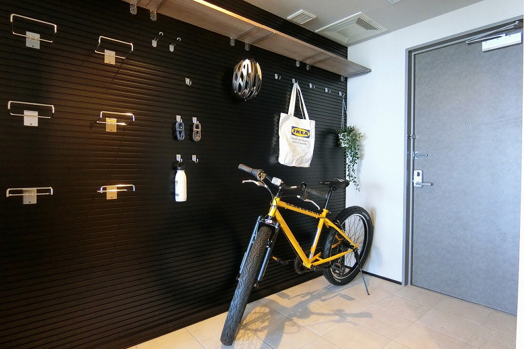 パナソニックの新商品インナーサッシで区切ったベッドルームが目を引くデザイナーズ仕様。話題の有孔ボードを設置した玄関の土間部分に、マウンテンバイクのディスプレイができます。有孔ボードにはフックなど付属品もつきますので、その他自由にディスプレイ可能です。