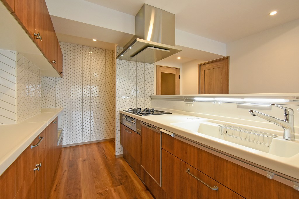 壁にはモザイクタイルをあしらったオープンキッチンが印象的なお料理好きにはたまらないお部屋。こちらのお部屋限定で、食洗機も完備!対面のカウンターは十分食事が可能なスペースを設けましたので、ダイニングテーブルとしてご使用いただけます。ベッドルームとサービスルームの間の室内窓は光を取り込めるガラス仕上げ。上部は開閉窓になっており、換気も可能です。