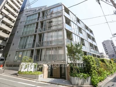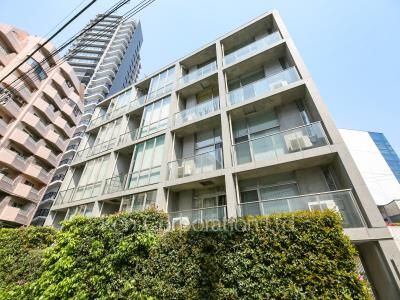 「プラウドジェム渋谷神南」。コンクリート打ちっぱなしにガラスウォールとお洒落な外観デザイン。明治神宮前駅徒歩9分、原宿10分、渋谷駅徒歩10分が最寄り駅と、高い利便性を誇りながらも喧噪から外れた静かで隠れ家的な立地に所在しており、住環境良好です。