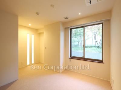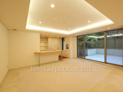広々としたリビング(28帖)からは敷地内の緑が望める心安らぐお部屋です。専用のテラスと庭(51.20㎡)付の住戸となります(傾斜地でエントランスが4階部分となるため実質1階の住戸です)。