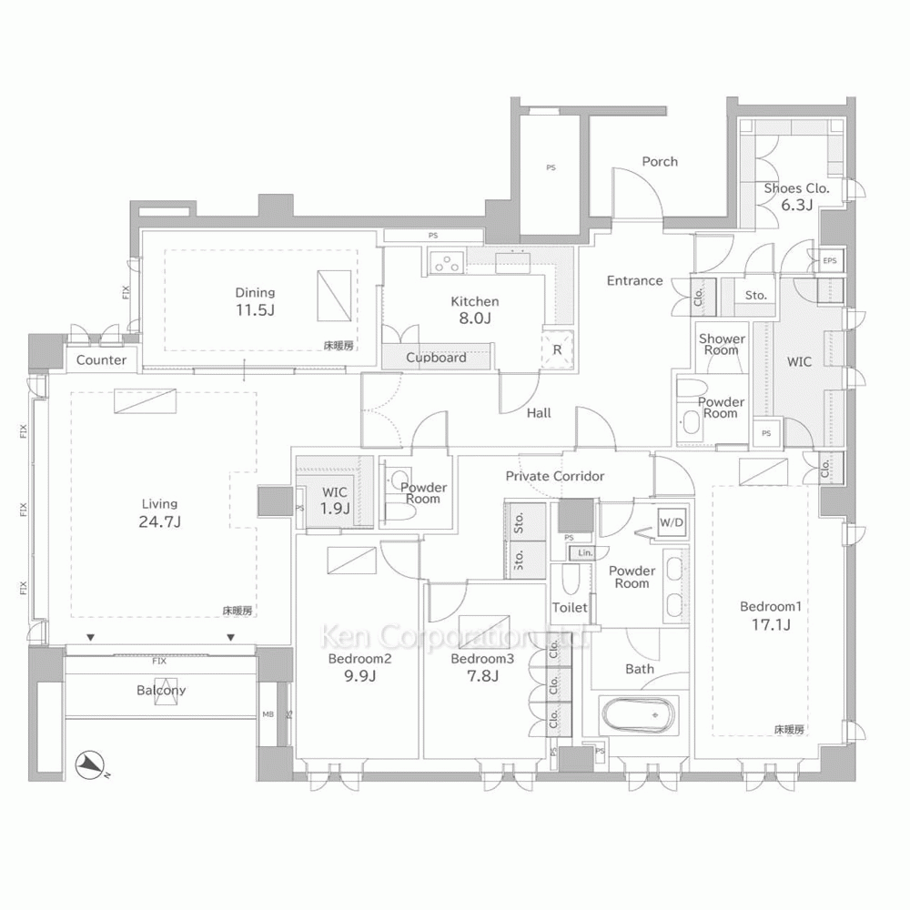 | 特徴 | 角部屋、 バルコニー、 2面採光、 LDK30帖以上、 床暖房、 一部フローリング |