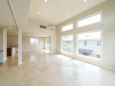 尾山台の高台に所在。アメリカ人建築家による設計による注文住宅。天井高のある南向きのリビングは窓の開口部も多く、開放的な空間を演出。オーナーのセンスの光る独立戸建。