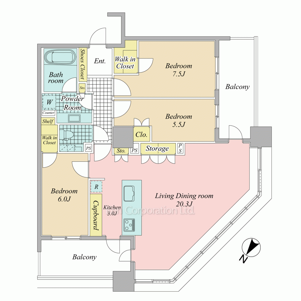 | 特徴 | 角部屋、 眺望良好、 バルコニー、 2面採光、 2面バルコニー、 天井高3m以上、 LDK20帖以上 |