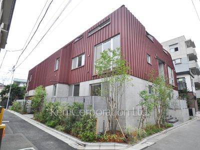オールメゾネットタイプのデザイナーズマンション「清音閣2」。ガルバリウム鋼板を使用した外壁、+コンクリート打放しの特徴的な外観。敷地内には緑が広がっています。