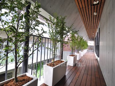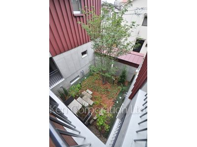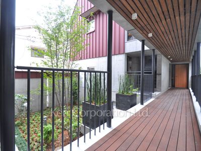 無垢のフローリングを使用したオールメゾネットの賃貸専用マンション。敷地内には緑が広がっています。