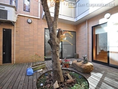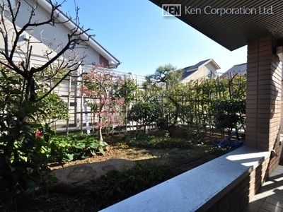 地下のパティオはバーベキュー利用可能です(隣棟と共用利用)。屋上庭園。シャッター付屋内駐車場。
