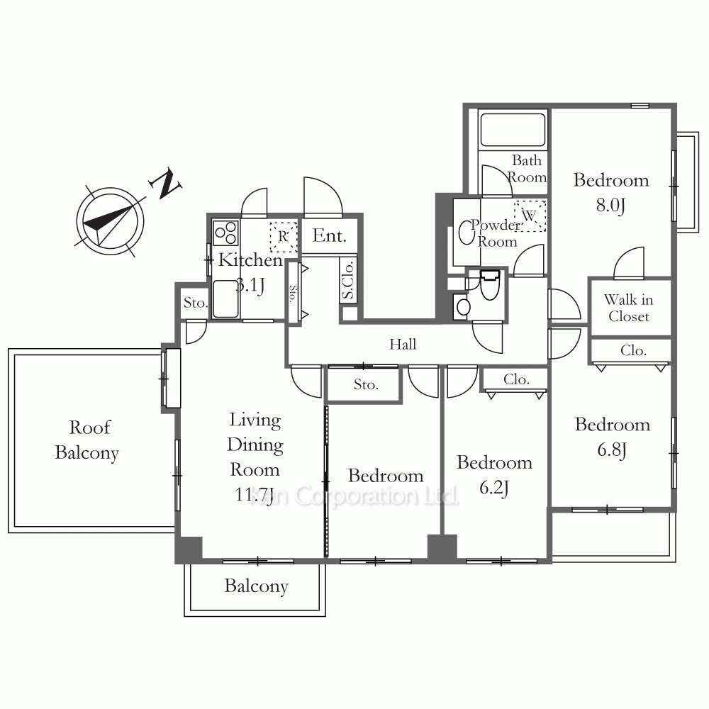 | 特徴 | 角部屋、 最上階、 1フロア1住戸、 眺望良好、 バルコニー、 ルーフバルコニー、 ウッドデッキ、 床暖房、 全面フローリング |