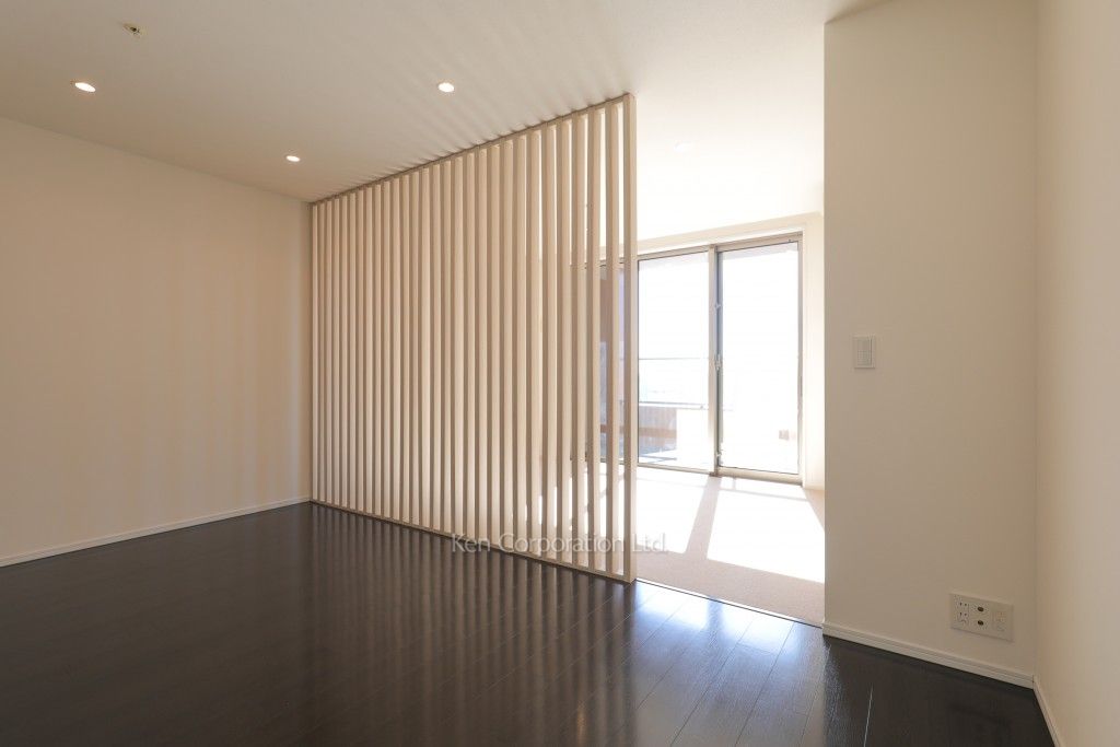 白基調のまとまりのあるお部屋となっております。追焚、浴室乾燥もついており設備も充実しています。また、リビングとベットルームの間には、スライド扉があり、自由に家具の配置を楽しめます。