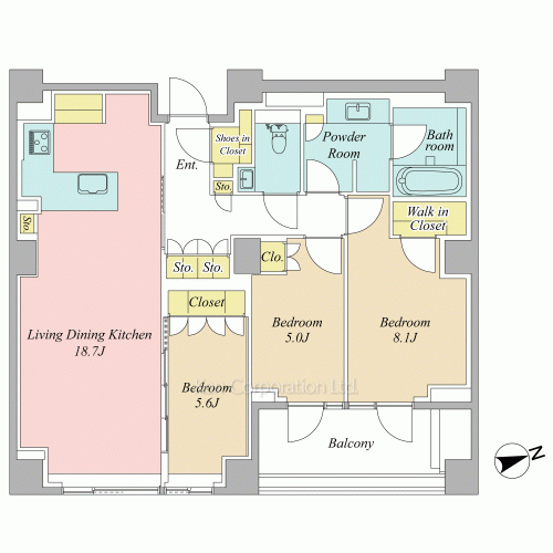 壁式工法採用により柱・梁の少ないプランニング・角住戸のような豊富な開口部のある設計やエレベーターは1フロア2住戸のみで利用し、二方向出入り口のエレベーター扉を採用しております(一部住戸)。その為、エレベーターを降りた瞬間にプライベートな領域が始まります。
