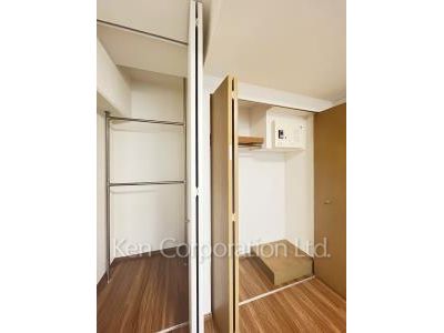 バスルームリフォーム!(2022年6月実施)床は家具が合わせやすいウォルナットを採用。アクセントクロスは人気のブラウン色。クローゼット横には、奥行と高さのあるストレージ付き★
