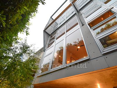 閑静な住宅地に建つデザイナーズ建築物件。吹き抜けにより開放感があり、エントランスや周辺には緑が溢れます。アメリカ製の設備、ルーフバルコニー付。