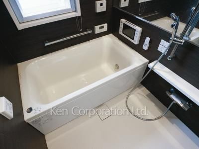 室内のタイル床に加え、壁面はビニールクロスではなくペイント仕上げとするなどこだわりの内装です。ミストサウナ機能、浴室TV、床暖房、セコム等設備が充実した物件です。