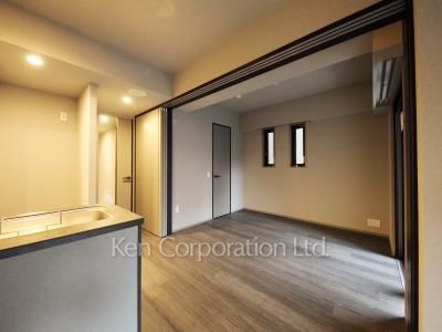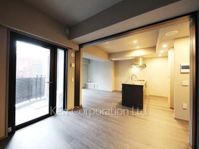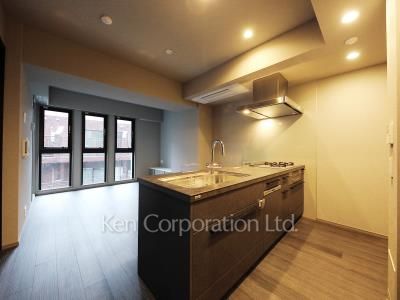 全邸南向き角住戸。モダンなデザインのオープンキッチンが特徴のリビングダイニングは窓が大きく設けられています。床暖房・食洗器・ディスポーザー・ミストサウナ付き。