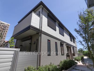 多摩川ガーデンテラスは玉川大師橋緑地沿いの通りとから一本北に入った通りの間に建つ軽量鉄骨造二階建てアパートです。大和ハウス工業の2階建鉄骨系賃貸シリーズ「セジュールウィット」。