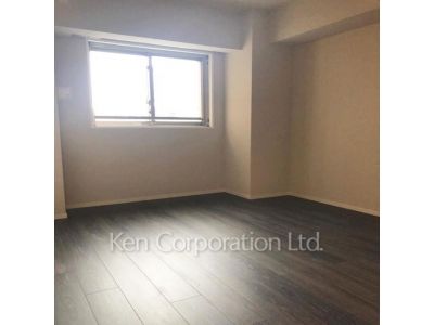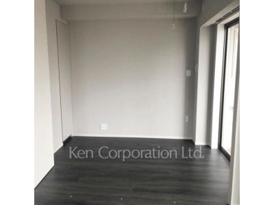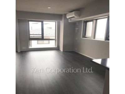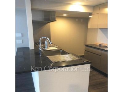 北西角の2LDK住戸。床はフローリング仕上げ、床暖房有。三口スコンロ・カウンターキッチンのお部屋です。分譲賃貸。