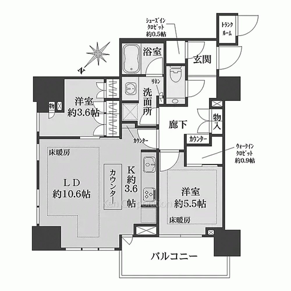 | 特徴 | 角部屋、 バルコニー、 2面採光、 床暖房、 一部フローリング |