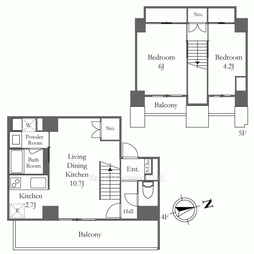 4階と5階部分のメゾネットタイプのお部屋です。2口コンロとグリル付きのシステムキッチン・バストイレ別・独立洗面台・浴室乾燥機・追い炊き機能付き。