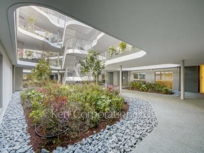 木と緑に溶け込む「杜」の玄関口である参宮橋エリアの高台に建つ総戸数86戸の低層マンション。外観から中庭へと繋がるように四季折々の樹木が植えられています。屋上に太陽光パネルを設置、省エネルギーな冷暖房設備を採用、ZEH基準に対応した高い断熱性を誇ります。ペットは小型犬または猫2匹まで飼育可能。ワークスペースもあり。