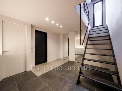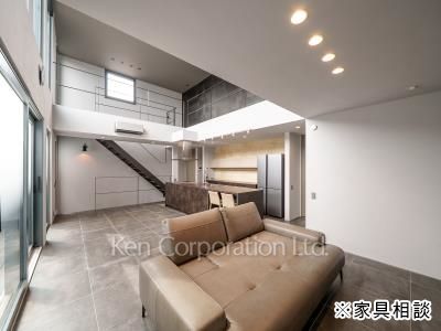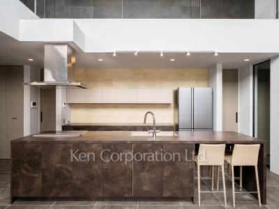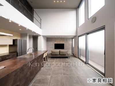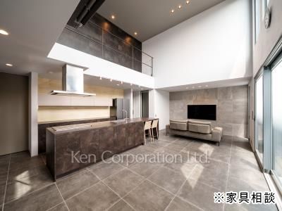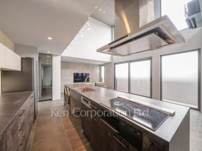 開放感のあるリビングダイニングキッチン 。吹き抜け部分の最高天井高は約5.3mあり、明るい室内空間です。大型オープンキッチンを採用しており、家族の会話も弾みます。ウォークインクローゼットや大型パントリー等豊富な収納も魅力です。広々とした玄関ホールには大型シューズインクローゼットも完備しております。顔認証キーを採用した最新のセキュリティシステムを完備しており、日々の生活を守ります。