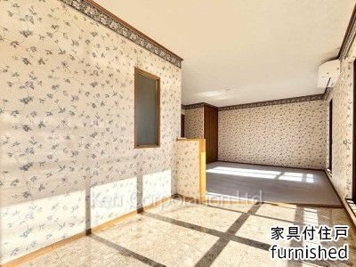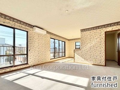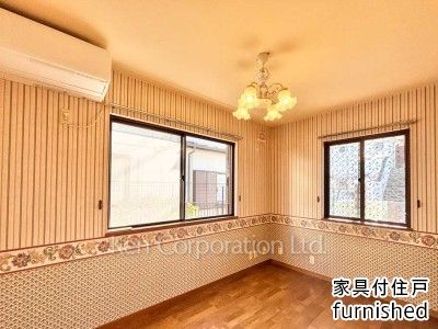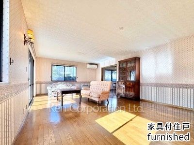 英国調のクラシカルな壁紙が特徴的な鉄筋コンクリート造戸建。英国製家具付(ダイニング/ソファセット)。リビングにガス暖房機有。2025年12月外壁メンテナンス(塗装等)実施済。