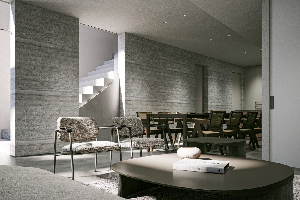 シームレスに空間が繋がるメゾネットタイプのガレージハウス。本実コンクリートの壁面が特徴の空間。ペット飼育相談可。