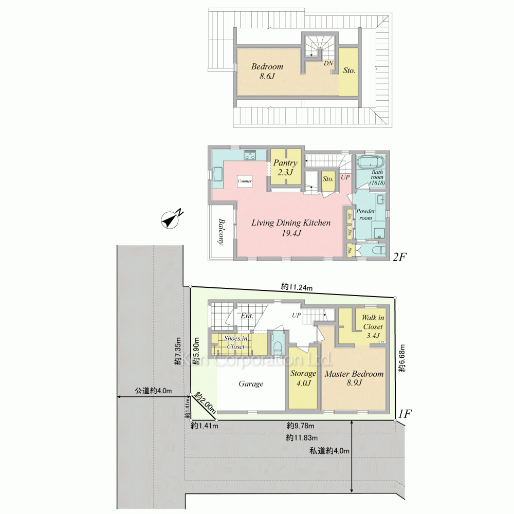 南西側 幅員約3.2m 接面約5.9m(公道) 東南側 幅員約2.5m 接面約9.7m(私道) |