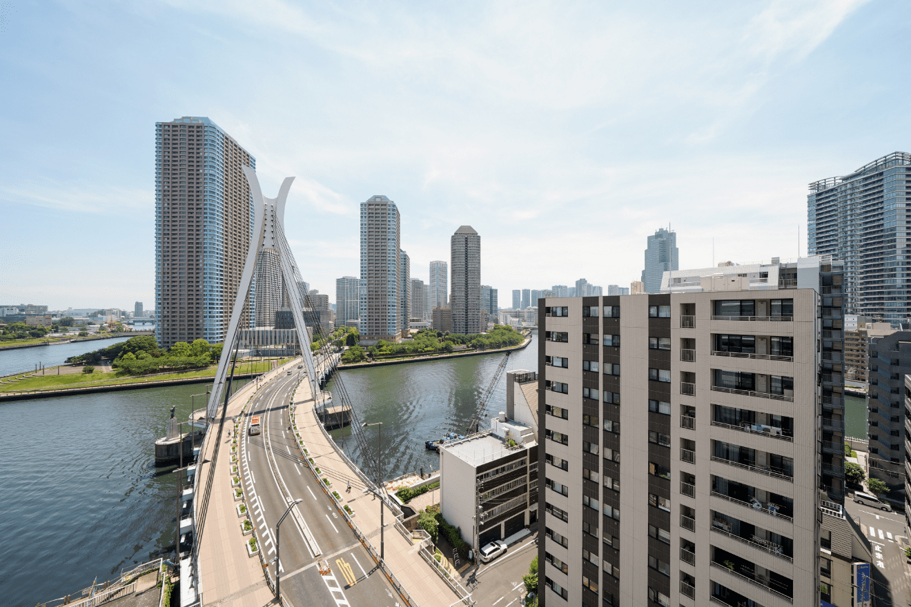 人気の高い対面キッチンの1LDKタイプ。料理をしながら眺めた景色はテレビでよく見かける高層タワーマンション群と隅田川の織りなす格別な景色を味わうことができます。各部屋にはオゾン破壊係数0のRE32を採用したエアコンを設置しています。