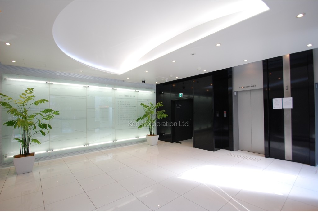 A-PLACE恵比寿東は明治通り沿いのオフィスビルとマンションが混在するエリアに所在するオフィスビルです。2008年にリニューアル済みで、外観はガラスカーテンウォールを採用した素敵なデザイン、エントランスホールは黒と白のシックな色合いになっております。設備としてはエレベーター2基、セキュリティはICカードによる機械警備システムを備えております。