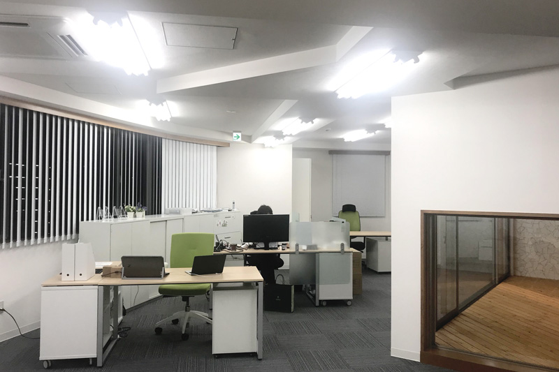 前オフィスの賃貸契約更新のタイミングで、今後の事業拡大や社員増員を見据えて新たにオフィスを探す事にしました。当初は1階の物件を中心に探しましたが中々ニーズに合う物件に出会えず、良いと思った物件に申し込んだら断られるなどかなり難航しました。希望エリアではない地域や1階以外の物件をいくつかご提案頂いた中で出会ったのが今のオフィスです。ビルの最上階でライトコートがあると言う珍しい作りですが、プロジェクションマッピングを手掛ける弊社としてはいろいろオフィス内で投影できる場所があるのが決め手となりました。首都高速の入口にも近く、地下鉄駅のすぐそばでアクセスの良さも魅力です。