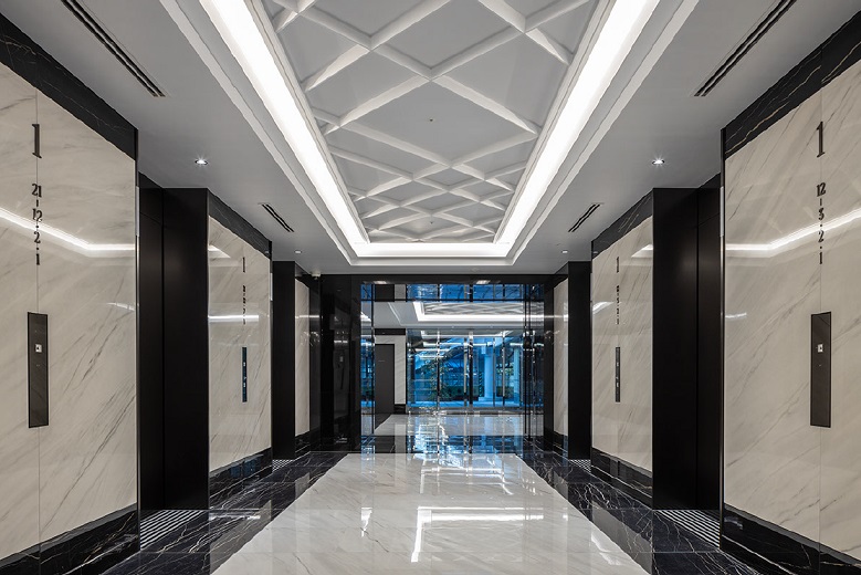 Kタワー横浜では1階に車をつけると、そこに車利用者のためのエレベーターホールがあり、そのまま、オフィスに直行できる仕組み。人にも車にも安全で、雨の日にも濡れずに移動できます。